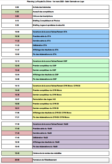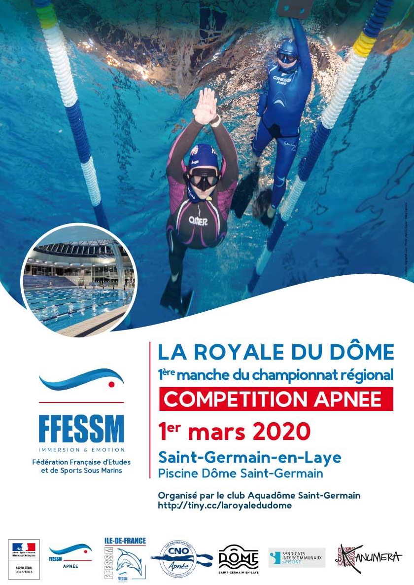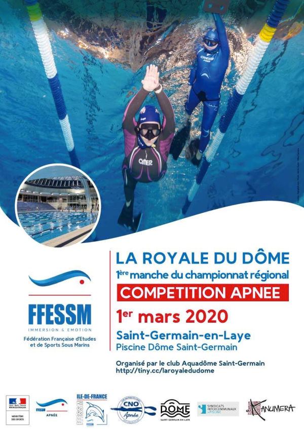 Première manche du championnat régional d’apnée Ile-de-France, La Royale du Dôme, a eu lieu à Saint-Germain-en-Laye, le dimanche 1er mars 2020 de 8 heures à 20 heures à la piscine Le Dôme Saint-Germain.