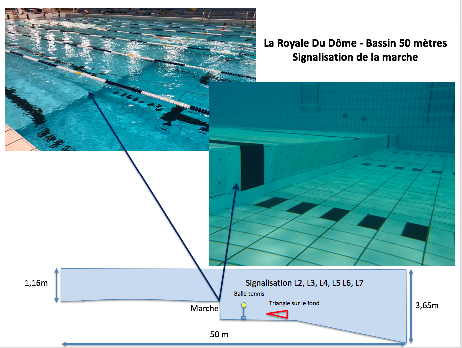 Le challenge a été de trouver une signalétique pour que les compétiteurs ne soient pas surpris par le mur mobile du bassin de 50 mètres qui a été rabaissé pour l’occasion. La marche que forme celui-ci a fait l’objet d’une signalétique spécifique comme présenté dans le schéma.