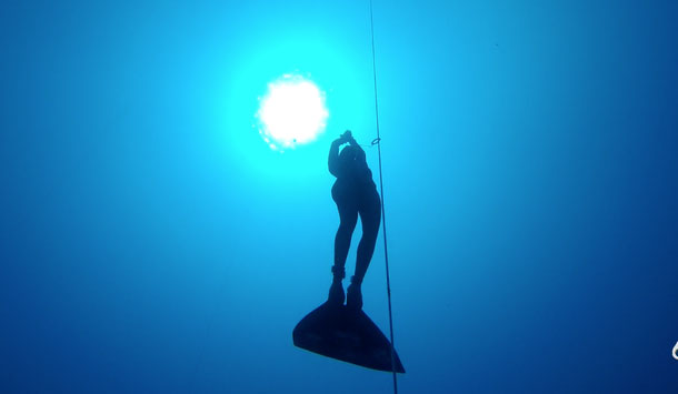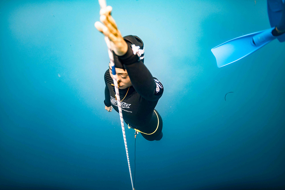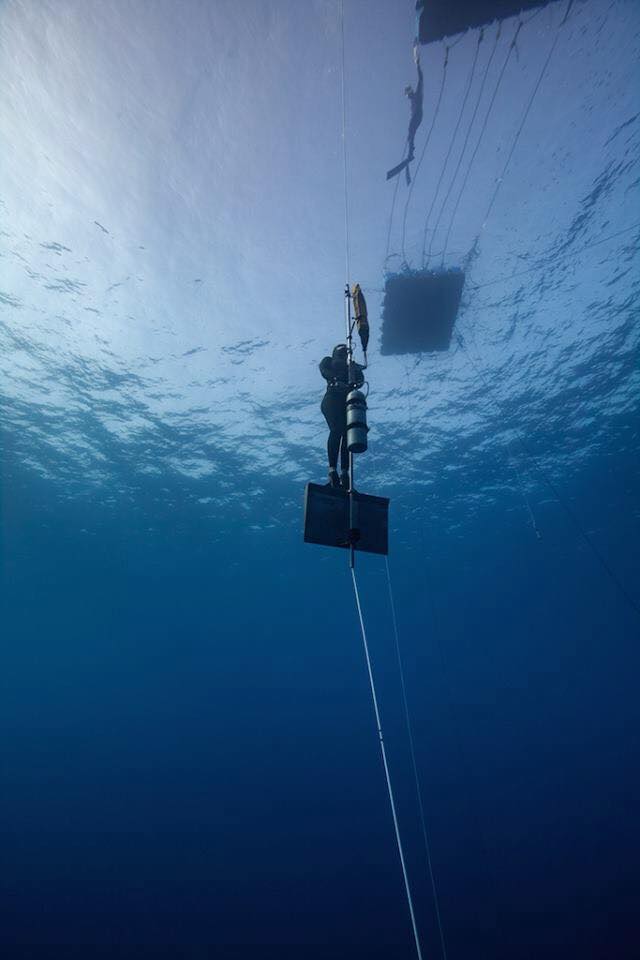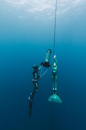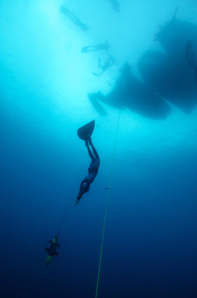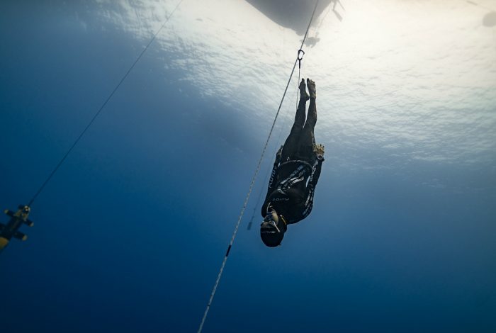 Hanako effectue une autre plongée à une profondeur de -106 mètres CWT établissant un nouveau record du monde lors de Vertical Blue en 2018.
