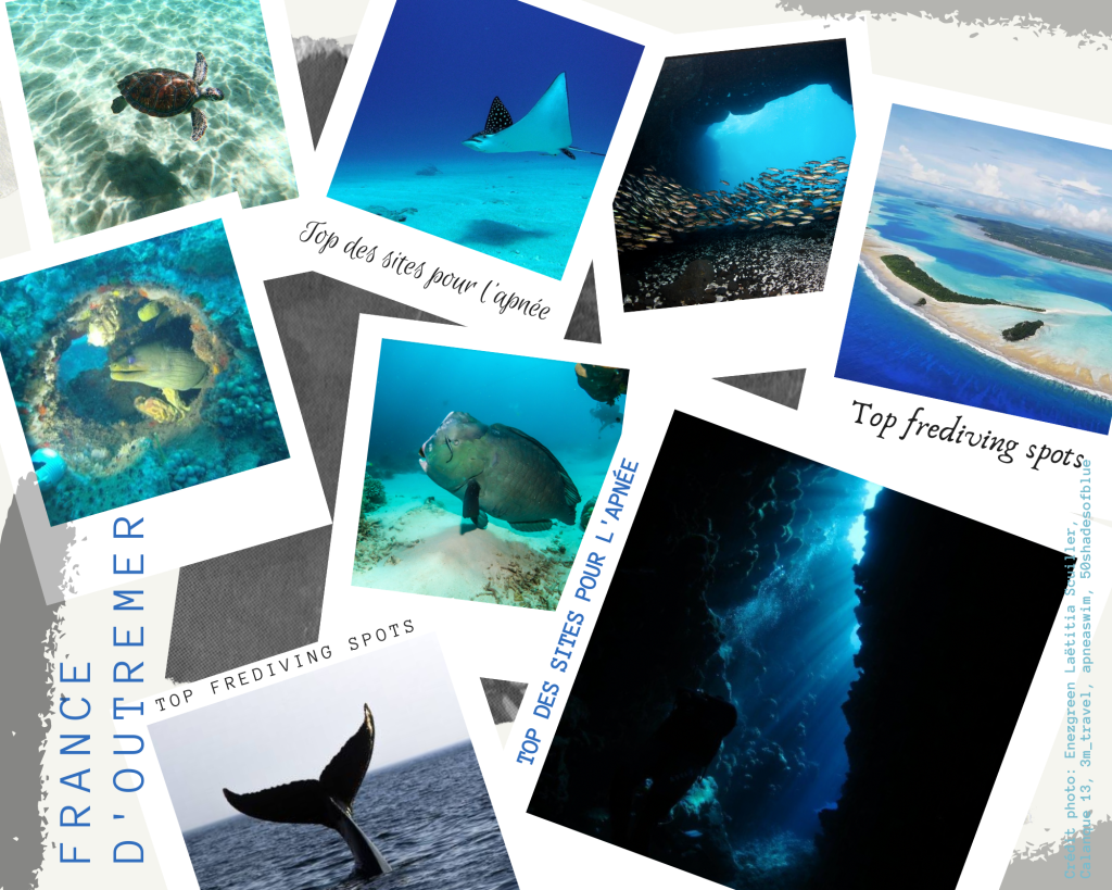 The Outre-mer that we use to call Dom-Tom, includes twelve territories : Guadeloupe, Guyane, Martinique, Réunion, Mayotte, New Caledonia, French Polynesia, Saint-Barthélemy, Saint-Martin, Saint-Pierre-et-Miquelon, French Southern and Antarctic Lands and Wallis & Futuna. Their common point is that they are all distributed in one of the following three oceans: the Atlantic Ocean, the Indian Ocean or the Pacific Ocean. These are also exceptional places where the seabed offers very nice freediving experiences.