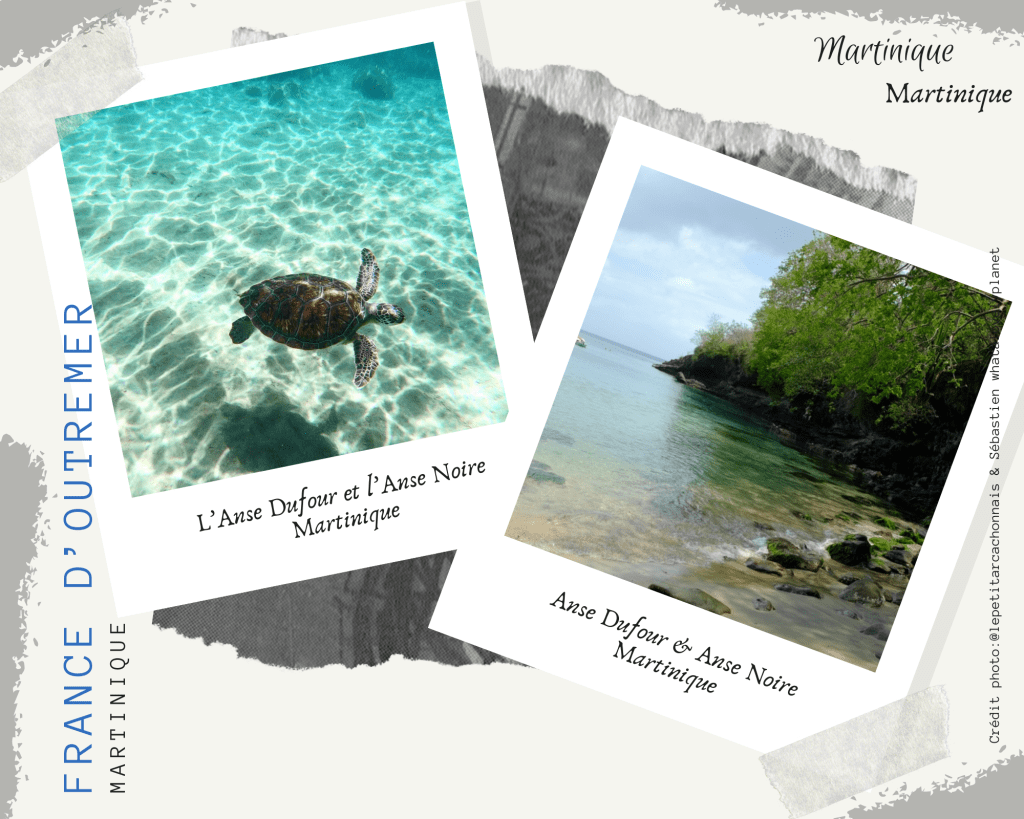 L’Anse Noire et l’Anse Dufour sont deux belles plages de Martinique l’une connue pour son sable noir et l’autre son sable blanc. Elles sont réputées pour la richesse de leurs fonds marins mais surtout pour être un lieu de rencontre privilégié avec les tortues vertes. On peut aussi observer de nombreux coraux, des éponges, des poissons-anges, et même des murènes. Les fonds sont tapissés d’une végétation abondante dans laquelle on peut y trouver des hippocampes.
